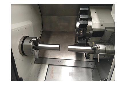 2)主軸箱及副主軸箱采用電主軸結(jié)構(gòu),主軸轉(zhuǎn)速高,剛性好,動態(tài)響應(yīng)快,提高了加工圓度和表面的精度。對列式雙電主軸結(jié)構(gòu)可在高速旋轉(zhuǎn)的情況下進(jìn)行工件交換,配合12工位伺服刀架,可實(shí)現(xiàn)對工件的全部或大部分工序的加工,很大程度上節(jié)省了裝夾和加工時間,提高了加工效率。雙C軸功能可在任一主軸上進(jìn)行工件分度和曲面插補(bǔ)加工。